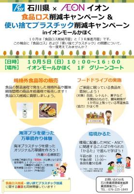 県では、環境への負荷が少ない循環型社会の実現に向けて、食品ロス削減と使い捨てプラスチック削減の取り組みを進めているところです。今般、その取り組みの一環として、県と包括連携協定を締結しており、「美味しいいしかわ食べきり協力店」、「使い捨てプラスチックの削減に関する協定」の取組にも参加いただいているイオン株式会社と連携し、10月の「食品ロス削減月間」と「3R推進月間」にあわせて、食品ロス削減キャンペーンと使い捨てプラスチック削減キャンペーンを同時に開催します。