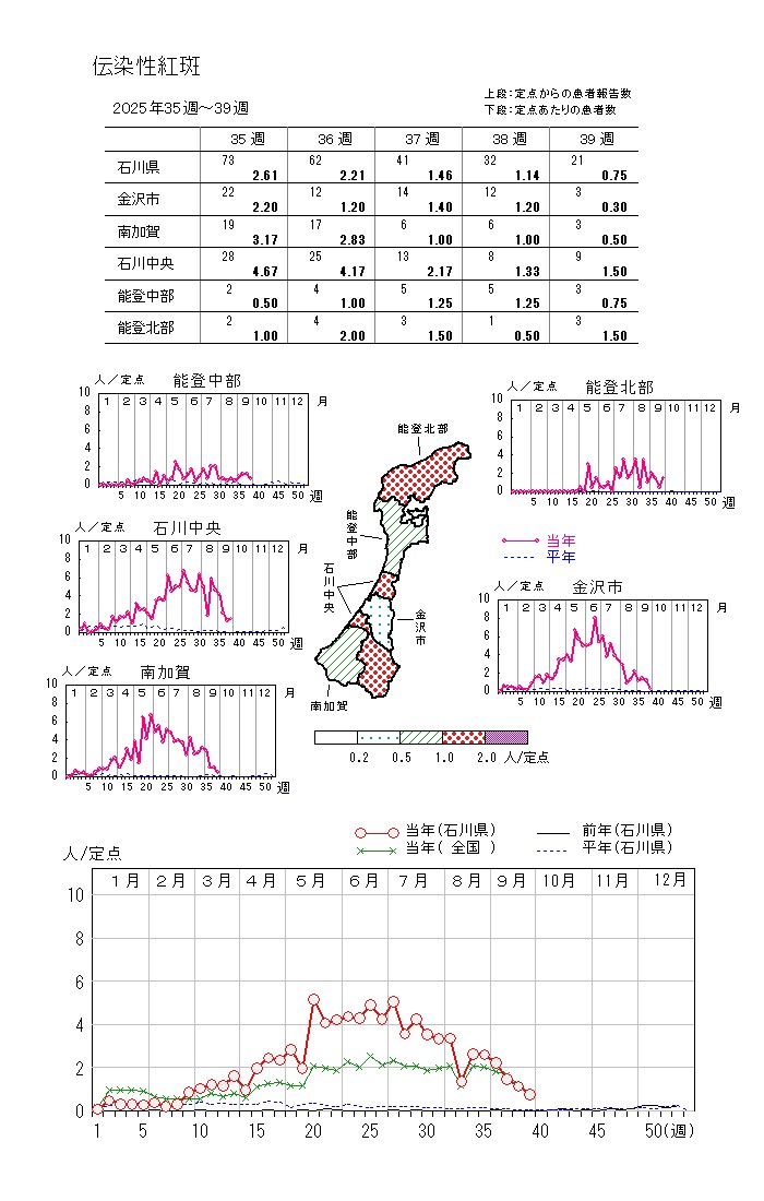 ・県全体の定点当たり患者報告数は0.75人となり、前週の1.14人より減少しました。 ・警報が発令されています。予防策等詳細は健康推進課のホームページに掲載されています。 |